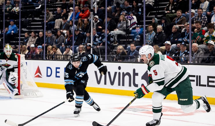 Minnesota Wild defenseman Jake Middleton (5) passes the puck past Utah Mammoth center Alexander Kerfoot (15) during an NHL game held at the Delta Center in Salt Lake City on Friday, Feb. 27, 2026. | Isaac Hale, Deseret News