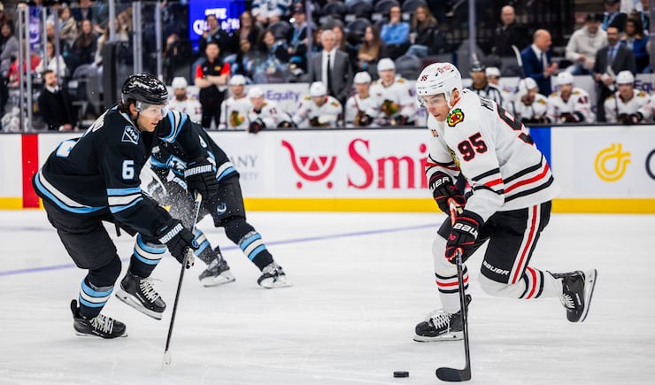 Chicago Blackhawks right wing Ilya Mikheyev (95) skates with the puck during an NHL game against the Utah Mammoth at the Delta Center in Salt Lake City on Sunday, March 1, 2026. | Tess Crowley, Deseret News