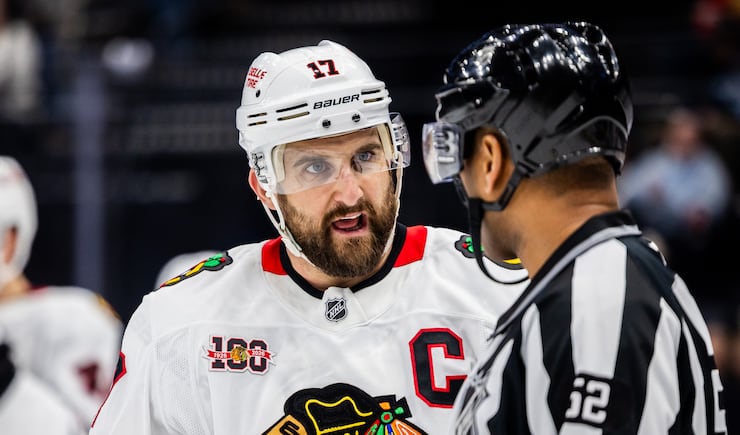 Chicago Blackhawks left wing Nick Foligno (17) talks to a referee during an NHL game against the Utah Mammoth at the Delta Center in Salt Lake City on Sunday, March 1, 2026. | Tess Crowley, Deseret News