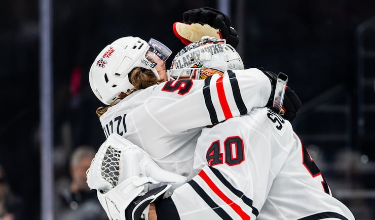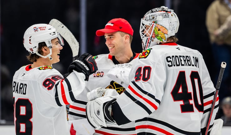 Chicago Blackhawks center Connor Bedard (98), left, embraces Chicago Blackhawks goaltender Arvid Söderblom (40), right, after winning against the Utah Mammoth during an NHL game at the Delta Center in Salt Lake City on Sunday, March 1, 2026. | Tess Crowley, Deseret News