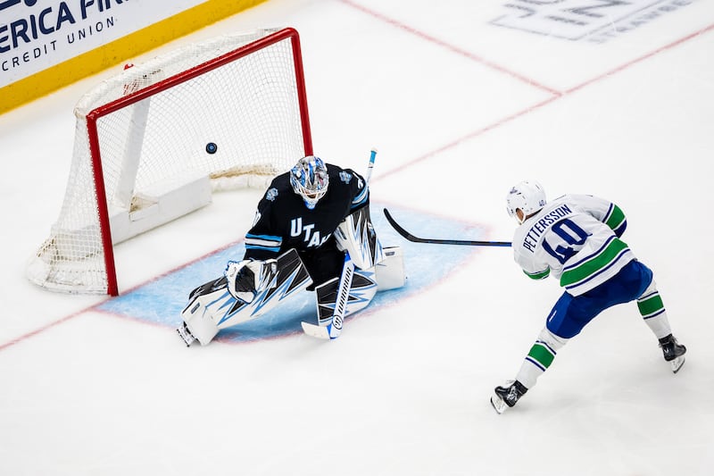 Utah Hockey Club goaltender Karel Vejmelka (70) attempts to stop Vancouver Canucks center Elias Pettersson (40) from scoring during an NHL game at the Delta Center in Salt Lake City on Sunday, Feb. 23, 2025. | Tess Crowley, Deseret News