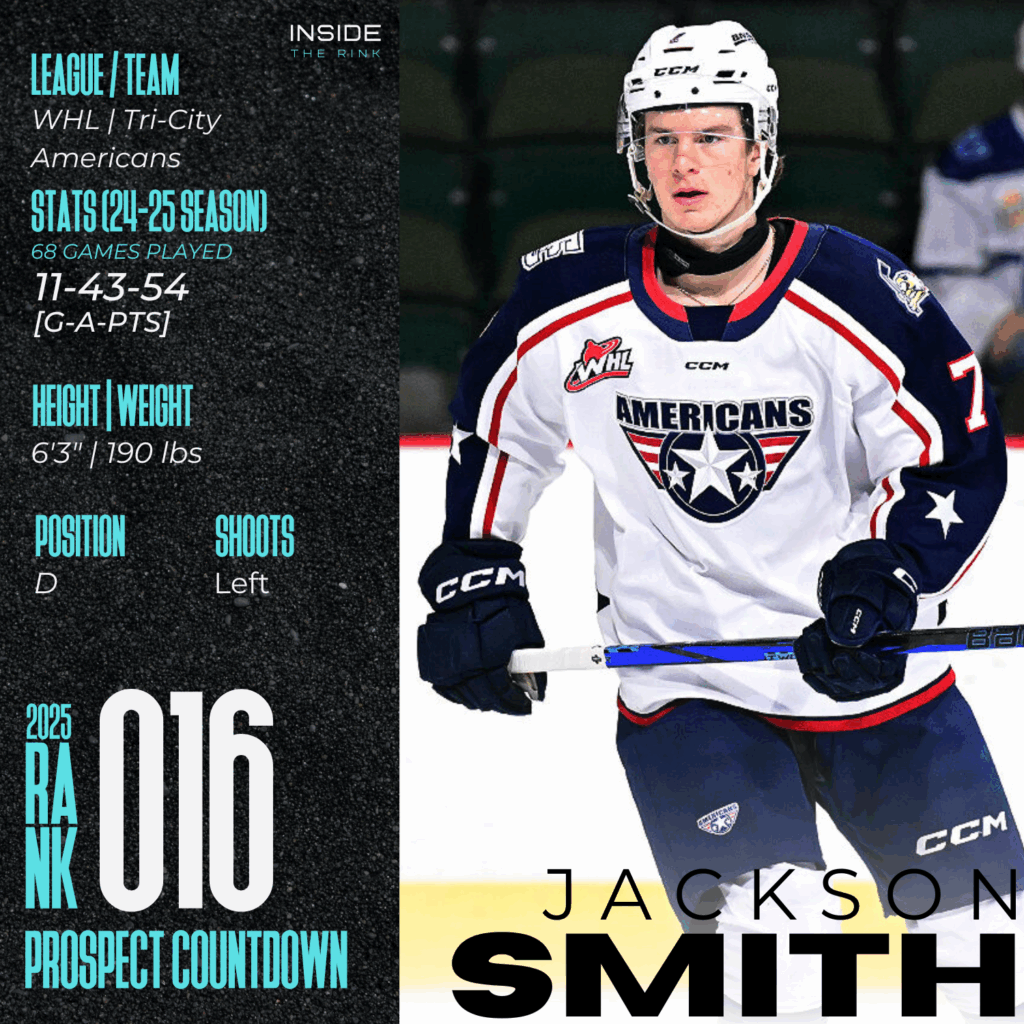 Jackson Smith is an 18-year-old left-shooting defenseman who spent the 2024-25 season with the Tri-City Americans. Smith is 6’3″ and was born on May 13, 2007, in Calgary, Alberta. He is projected to be drafted in the top 20 during the 2025 NHL Entry Draft.
