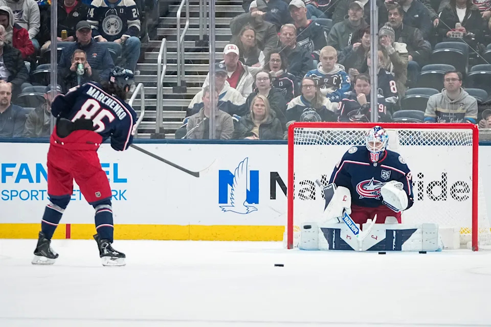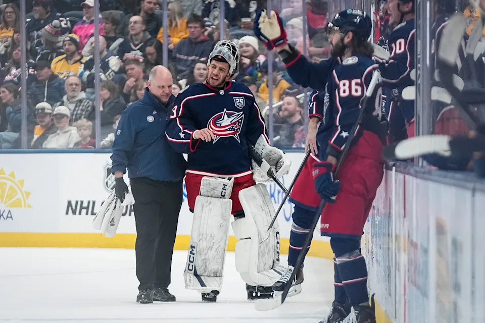 Columbus Blue Jackets right wing Kirill Marchenko (86) helps warm up goaltender Elvis Merzlikins (90) after goaltender Jet Greaves (73) left the first period of the NHL hockey game against the Nashville Predators at Nationwide Arena in Columbus on March 3, 2026.