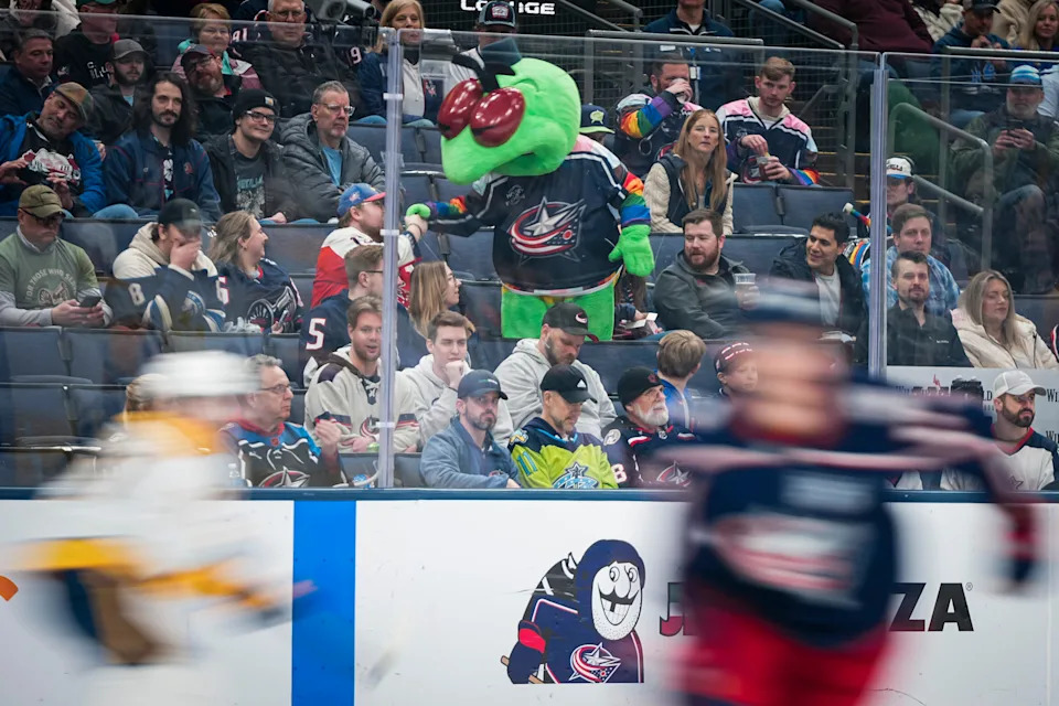 Columbus Blue Jackets mascot Stinger interacts with fans during the first period of the NHL hockey game against the Nashville Predators at Nationwide Arena in Columbus on March 3, 2026.