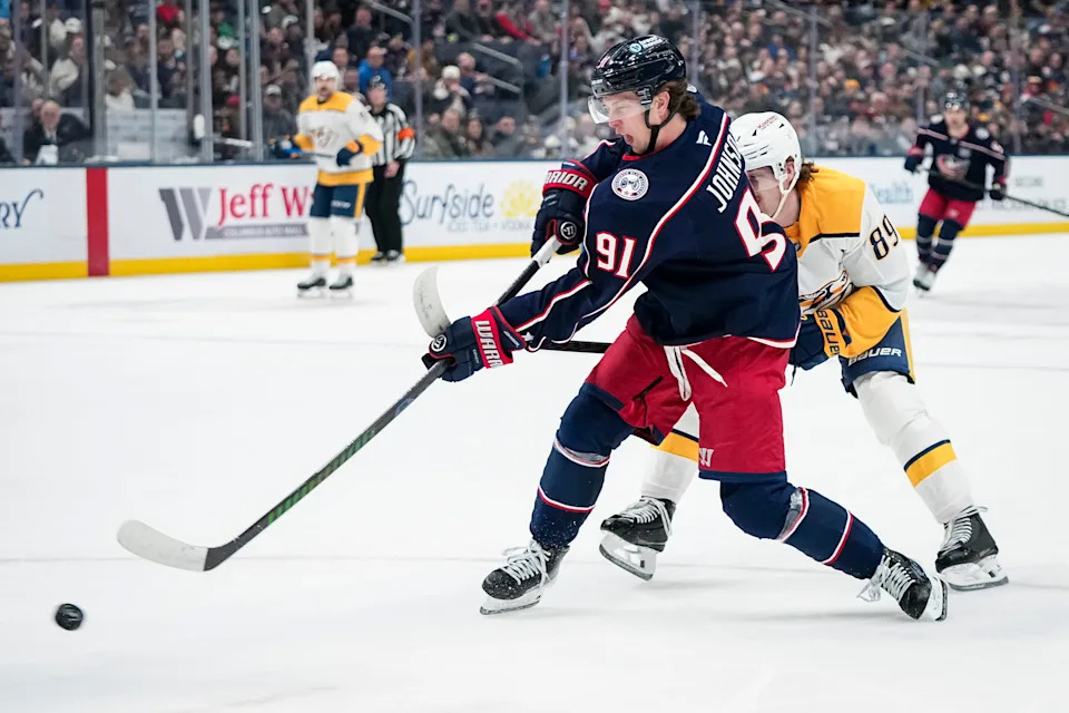 Columbus Blue Jackets center Kent Johnson (91) shoots past Nashville Predators center Ozzy Wiesblatt (89) during the first period of the NHL hockey game at Nationwide Arena in Columbus on March 3, 2026.