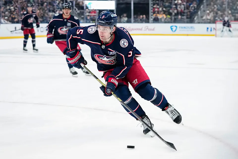 Columbus Blue Jackets defenseman Denton Mateychuk (5) skates during the first period of the NHL hockey game against the Nashville Predators at Nationwide Arena in Columbus on March 3, 2026.