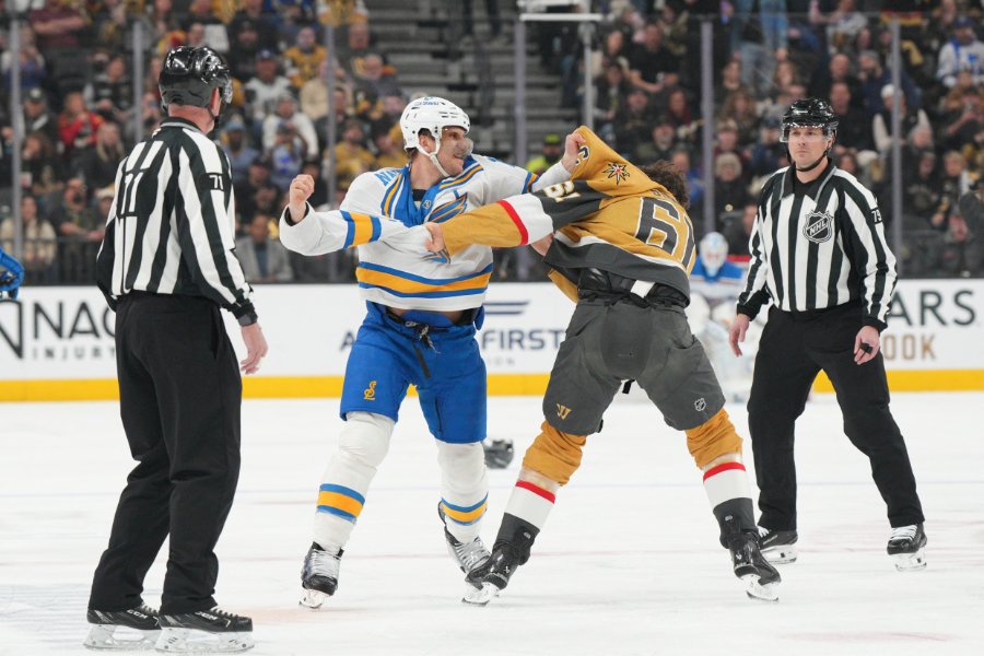 St. Louis Blues center Brayden Schenn, center left, and Vegas Golden Knights right wing Mark Stone (61) fight during the first period of an NHL hockey game Saturday, Jan. 10, 2026, in Las Vegas. (AP Photo/Candice Ward)