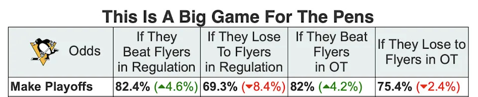 MoneyPuck projects a major swing in the Penguins’ playoff odds based on the outcome of today’s home game.