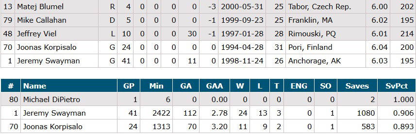 Goalies: Joona Korpisalo (Jeremy Swayman played yesterday)