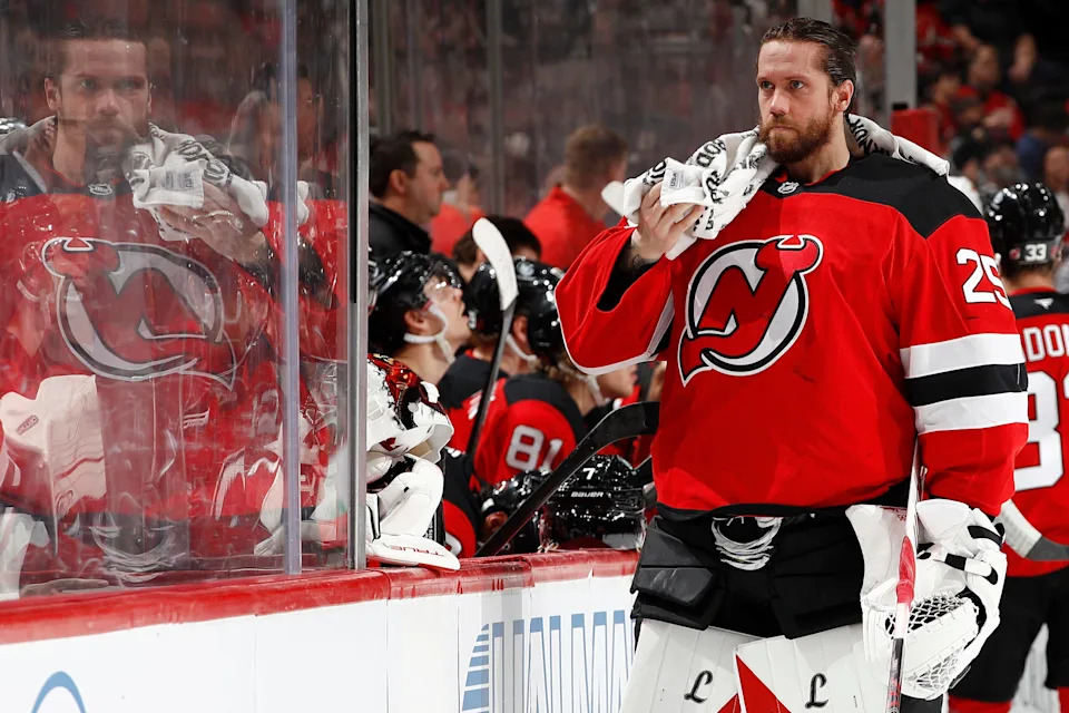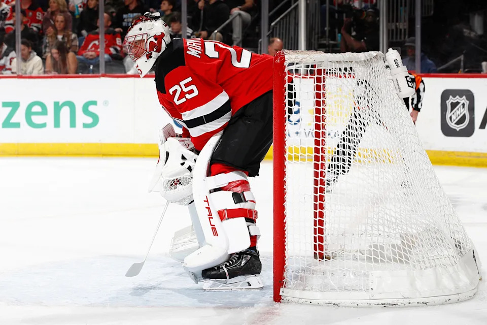 Jacob Markstrom of the New Jersey Devils looks on during the first period against the Detroit Red Wings at Prudential Center in Newark, New Jersey, on Sunday, March 8.