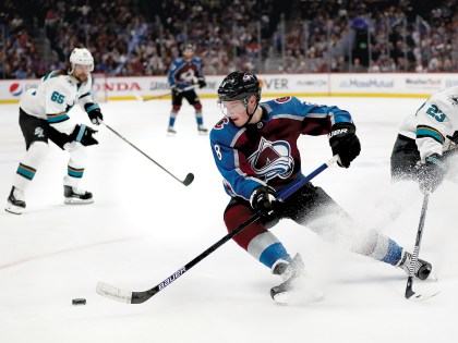 Cale Makar (8) of the Colorado Avalanche deking a San Jose Shark. Photo courtesy of the Colorado Avalanche.