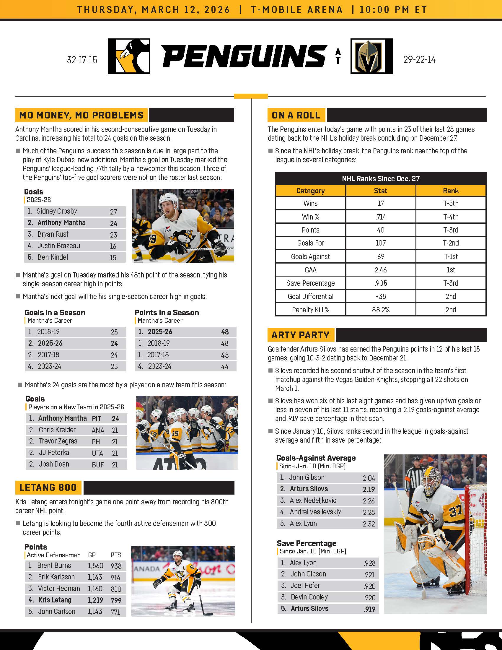 Who: Pittsburgh Penguins (32-17-15, 72 points, 2nd place Metropolitan Division) @ Vegas Golden Knights (29-22-14, 75 points, 3rd place Pacific Division)