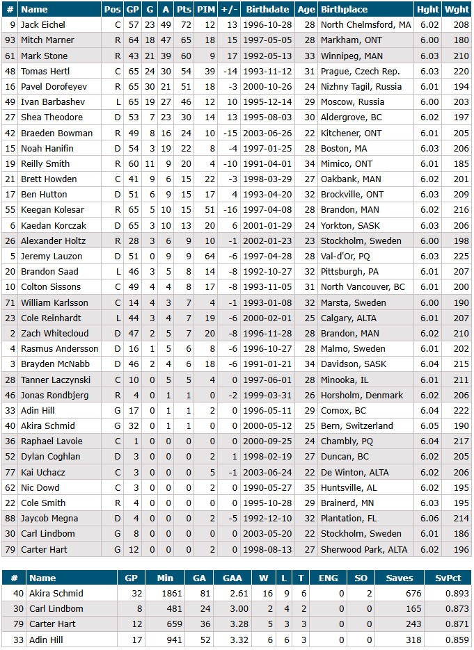 Injured Reserve: Mark Stone, Carter Hart, Alex Pietrangelo, William Karlsson