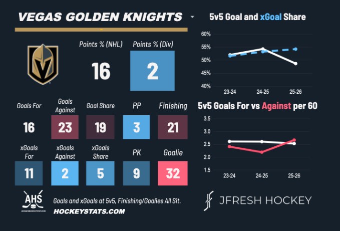 Vegas would easily be in first place in the weakest division in hockey, if they only had some goalie support. The white line plunging down in the upper right of this chart is more deflating than seeing the roulette wheel hit green for the second time in a row.