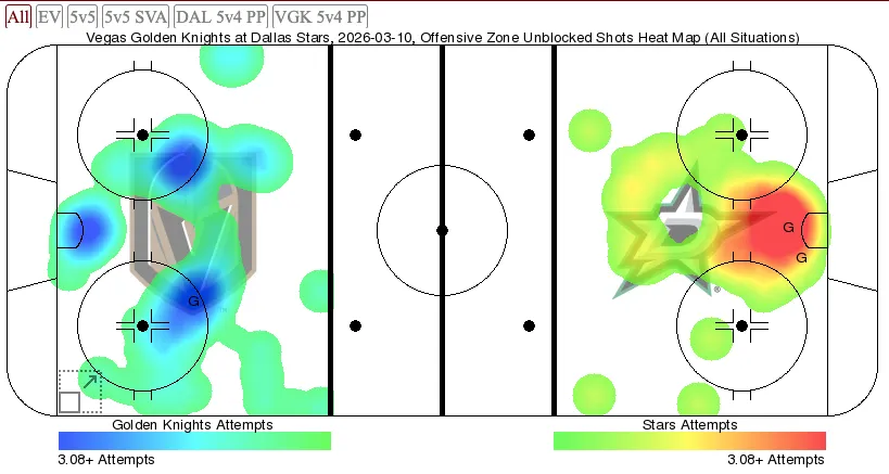 The Dallas game was the culmination of VGK’s unwillingness to get to the front of the net. The Stars scored both of their goals right in front of Adin Hill’s crease while VGK attempted just three shots from the most dangerous area of the ice.