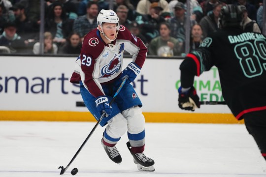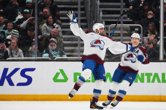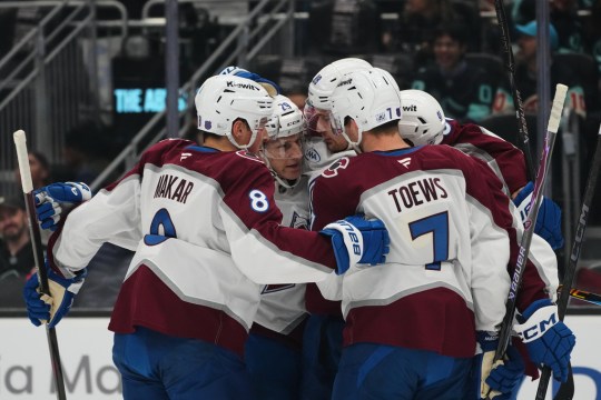 Colorado Avalanche center Martin Necas (88) scores against Seattle Kraken goaltender Joey Daccord (35) during the first period of an NHL hockey game Thursday, March 12, 2026, in Seattle. (AP Photo/Lindsey Wasson)Colorado Avalanche center Nathan MacKinnon (29) moves the puck against Seattle Kraken center Frederick Gaudreau (89) during the first period of an NHL hockey game Thursday, March 12, 2026, in Seattle. (AP Photo/Lindsey Wasson)Colorado Avalanche center Martin Necas (88) reacts to scoring as Seattle Kraken defenseman Adam Larsson (6) looks on during the first period of an NHL hockey game Thursday, March 12, 2026, in Seattle. (AP Photo/Lindsey Wasson)Colorado Avalanche center Martin Necas, third from left, celebrates his goal against the Seattle Kraken with teammates, including defenseman Cale Makar (8), center Nathan MacKinnon (29) and defenseman Devon Toews (7) during the first period of an NHL hockey game Thursday, March 12, 2026, in Seattle. (AP Photo/Lindsey Wasson)Colorado Avalanche center Nazem Kadri, left, celebrates scoring against the Seattle Kraken with center Nathan MacKinnon, right, during the second period of an NHL hockey game Thursday, March 12, 2026, in Seattle. (AP Photo/Lindsey Wasson)