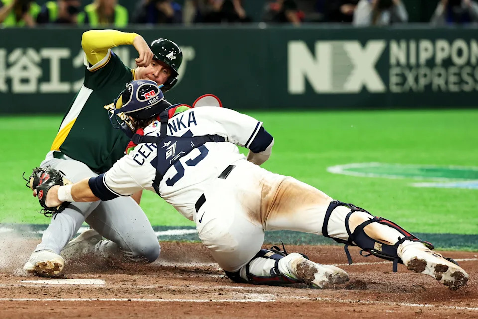 Robbie Perkins #9 of Team Australia is tagged out at home by Martin Cervenka #55 of Team Czechia in the ninth inning during the 2026 World Baseball Classic Pool C game between Australia and Czechia at Tokyo Dome on March 6, 2026 in Tokyo, Japan.