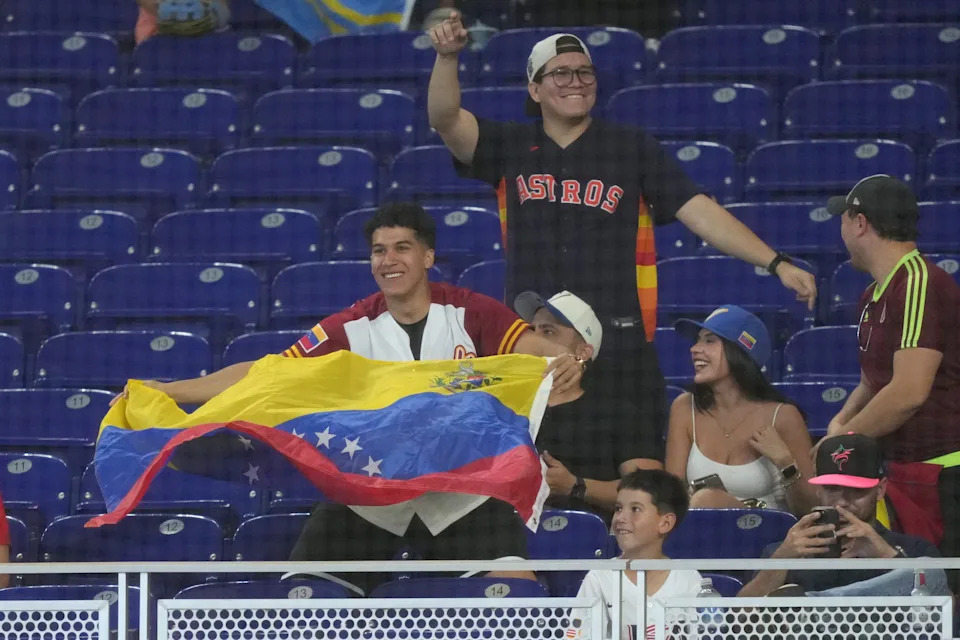 Venezuelan baseball fans show their support for their team against the Netherlands at loanDepot Park on March 6, 2026 in Miami.