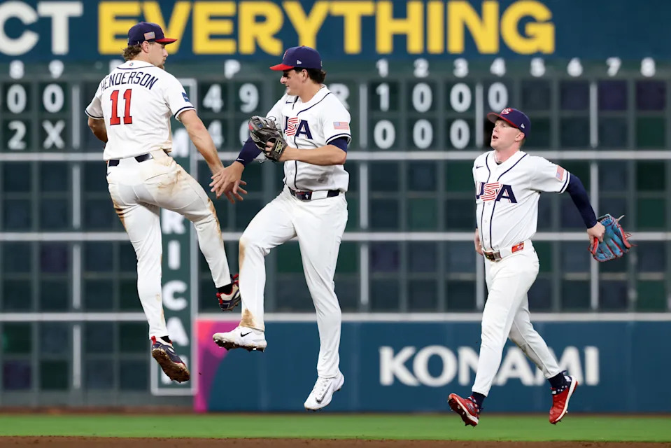 United States shortstop Gunnar Henderson (11), right fielder Roman Anthony (3) and center fielder Pete Crow-Armstrong (4) celebrate after the game against Great Britain at Daikin Park.