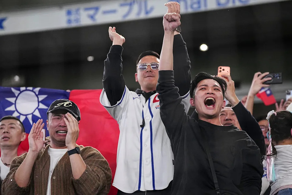 Fans celebrate Taiwan’s victory after the World Baseball Classic (WBC) Pool C game between Taiwan and South Korea at the Tokyo Dome in Tokyo on March 8, 2026.