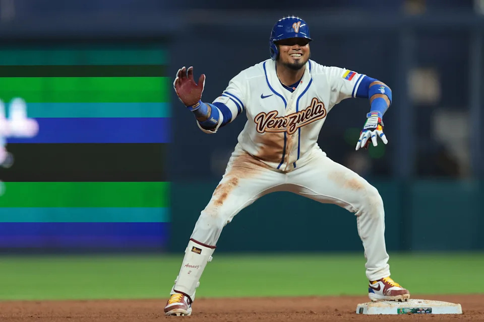 Venezuela first baseman Luis Arraez reacts from second base after hitting a double against Israel during the eighth inning at loanDepot Park on March 7, 2026 in Miami.
