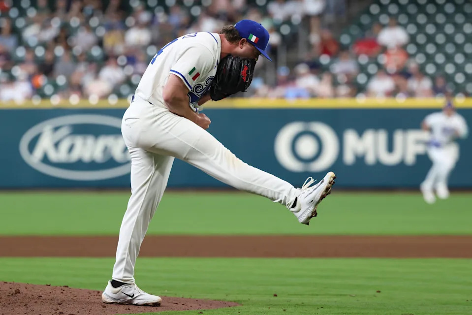 Italy pitcher Gordon Graceffo (44) reacts after getting an out during the seventh inning against Brazil at Daikin Park on March 7, 2026 in Houston.