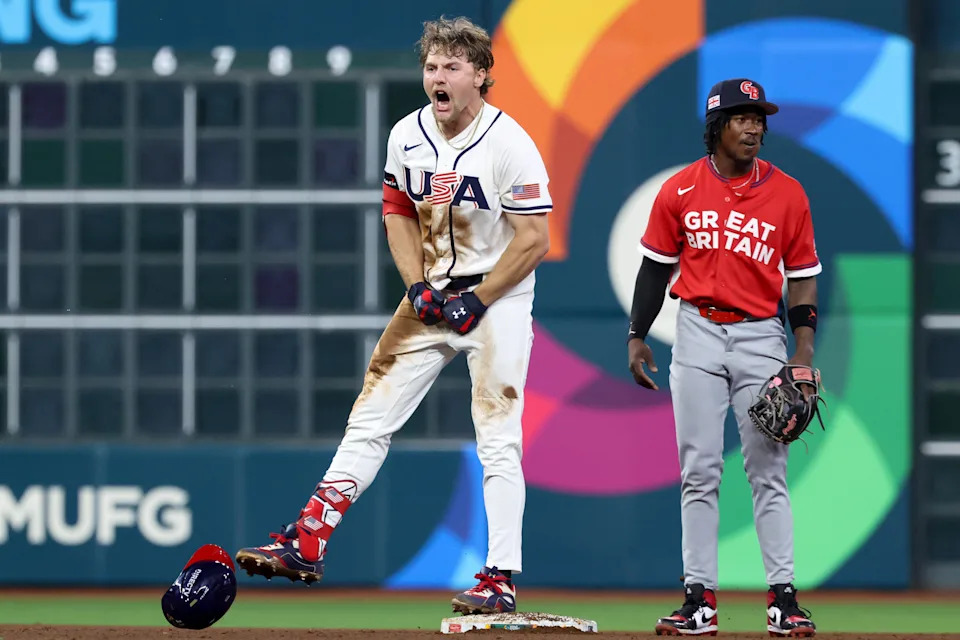 United States shortstop Gunnar Henderson (11) celebrates after hitting a two-run double against Great Britain during the fifth inning at Daikin Park on Mar 7, 2026.