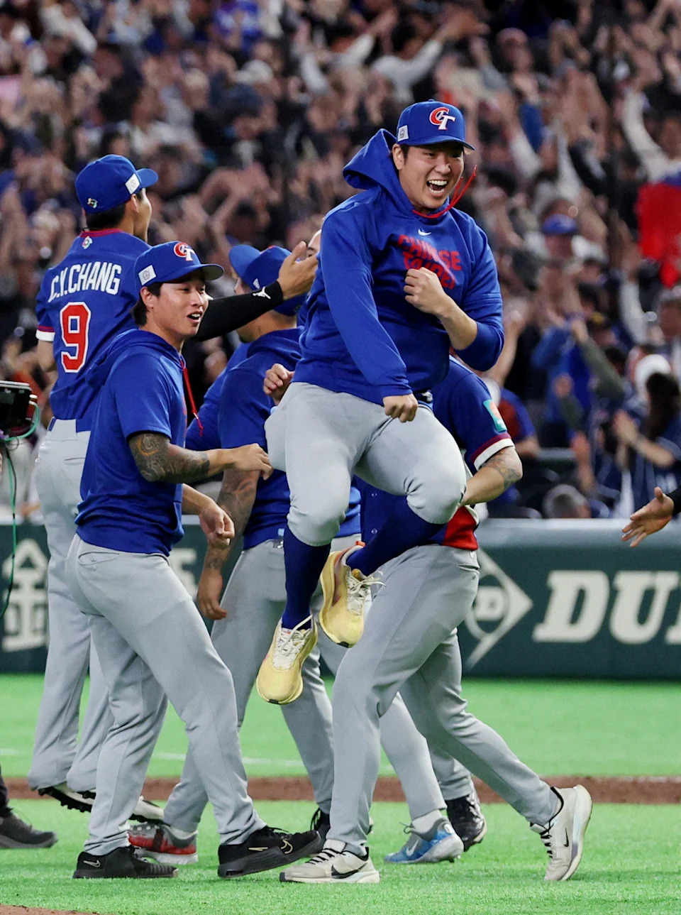 Taiwan players celebrate after winning their game against South Korea on March 8, 2026 at the Tokyo Dome, Tokyo, Japan.