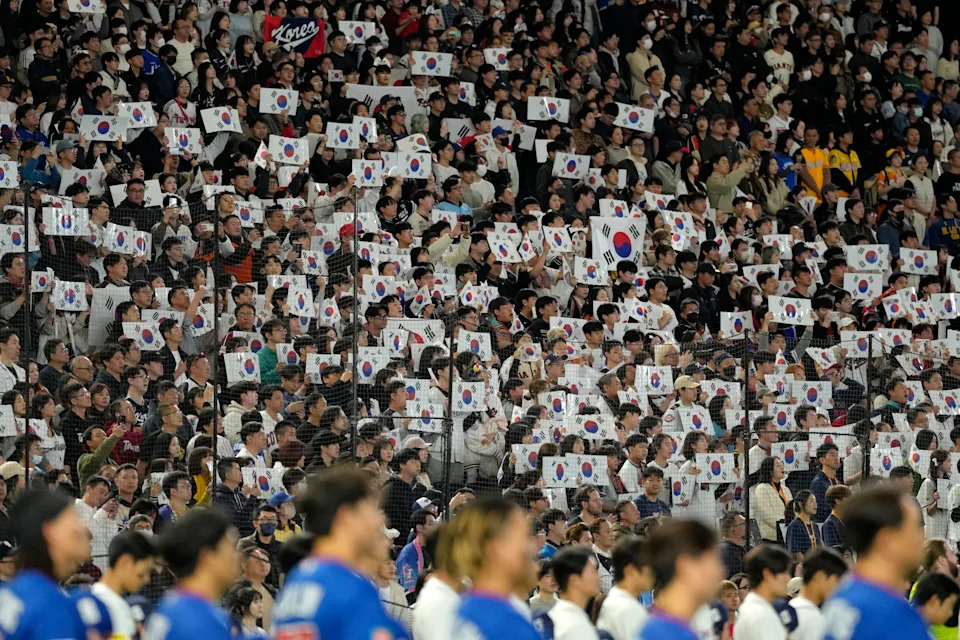 Fans hold up Korean national flags as they stand for the national anthem prior to the 2026 World Baseball Classic Pool C game between Chinese Taipei and South Korea at Tokyo Dome on March 8, 2026 in Tokyo, Japan.
