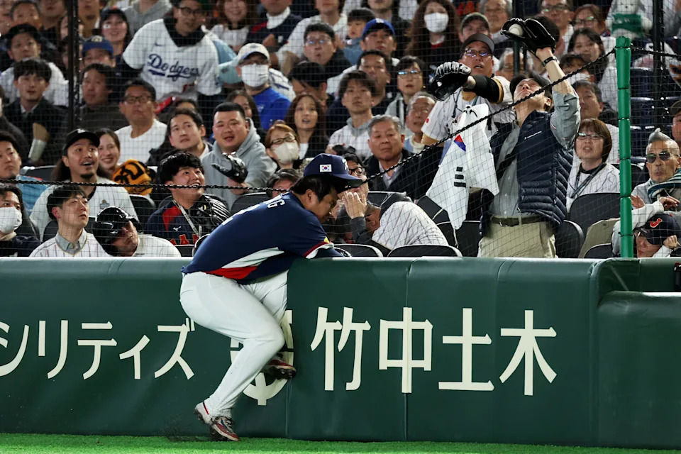 Bo Gyeong Moon of Team Republic of Korea collides with fence in the seventh inning during the 2026 World Baseball Classic Pool C game between South Korea and Japan at Tokyo Dome on March 7, 2026 in Tokyo, Japan.