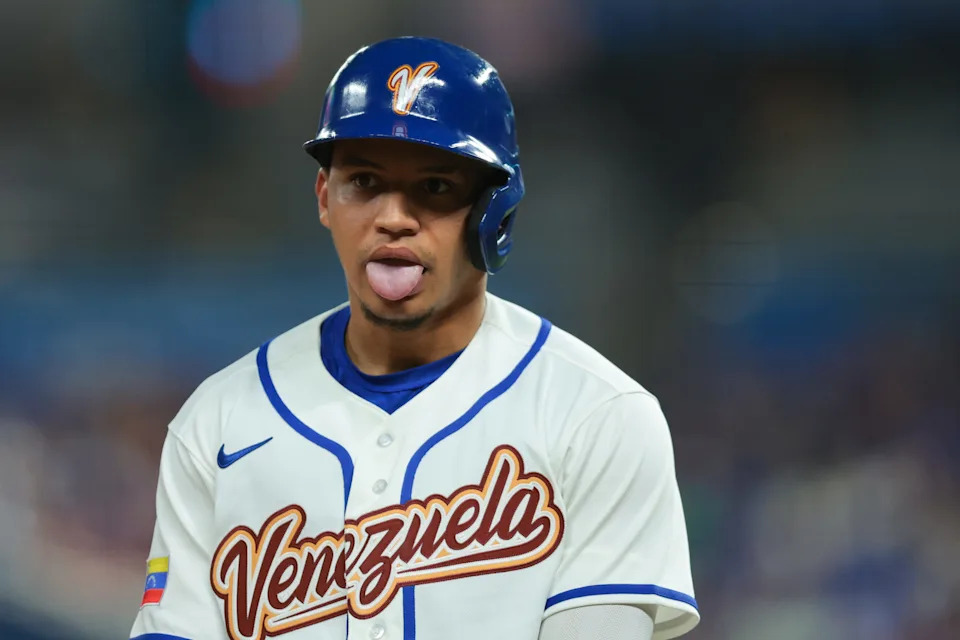 Venezuela center fielder Javier Sanoja reacts from third base against Israel during the seventh inning at loanDepot Park on March 7, 2026 in Miami.