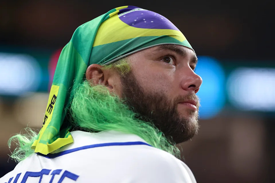 Brazil first baseman Dante Bichette Jr. (77) looks on from the dugout during the third inning against the United States at Daikin Park on March 6, 2026 in Houston