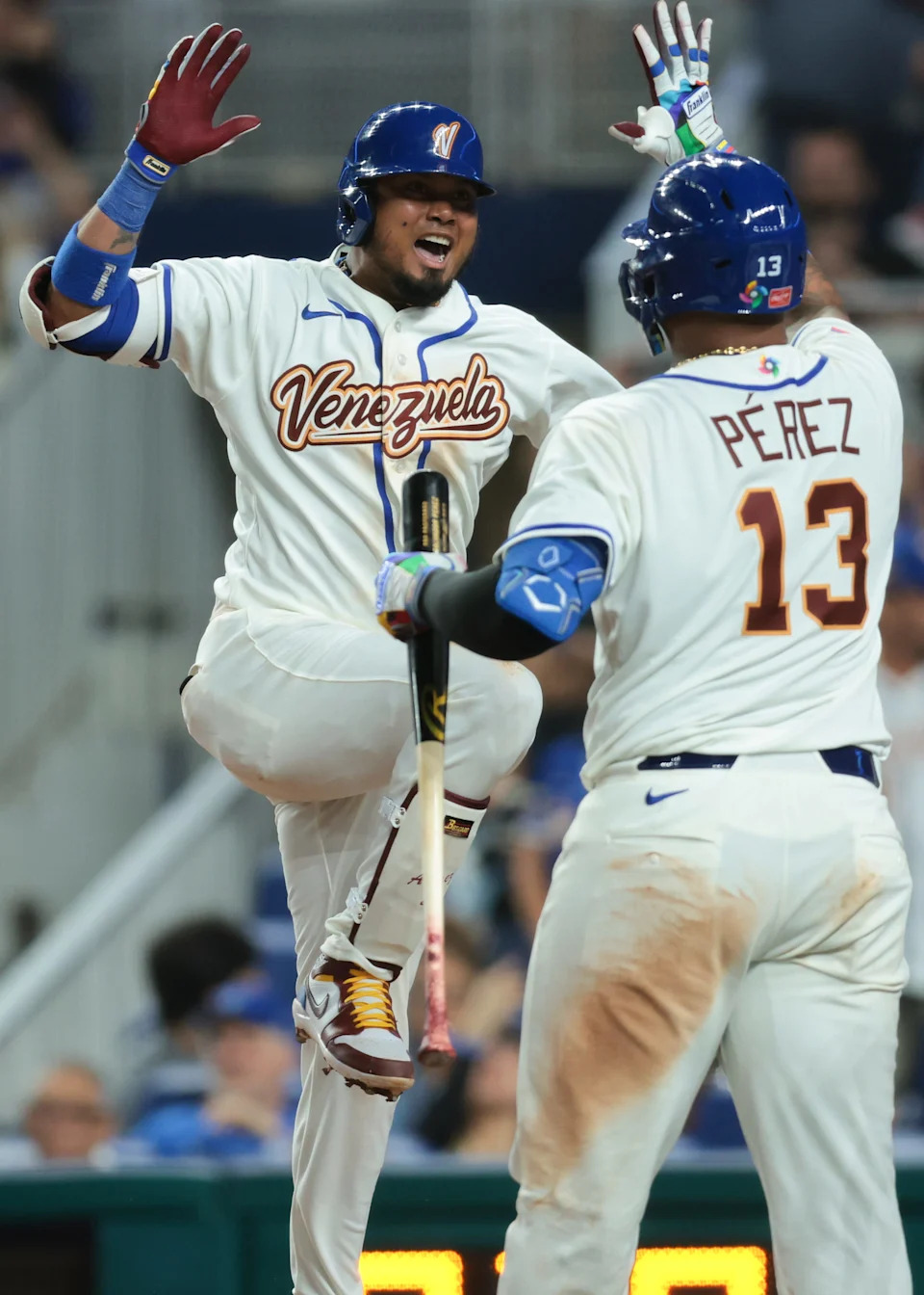 Venezuela first baseman Luis Arraez (2) celebrates with catcher Salvador Perez (13) after hitting a two-run home run against Israel during the sixth inning at loanDepot Park on March 7, 2026 in Miami.