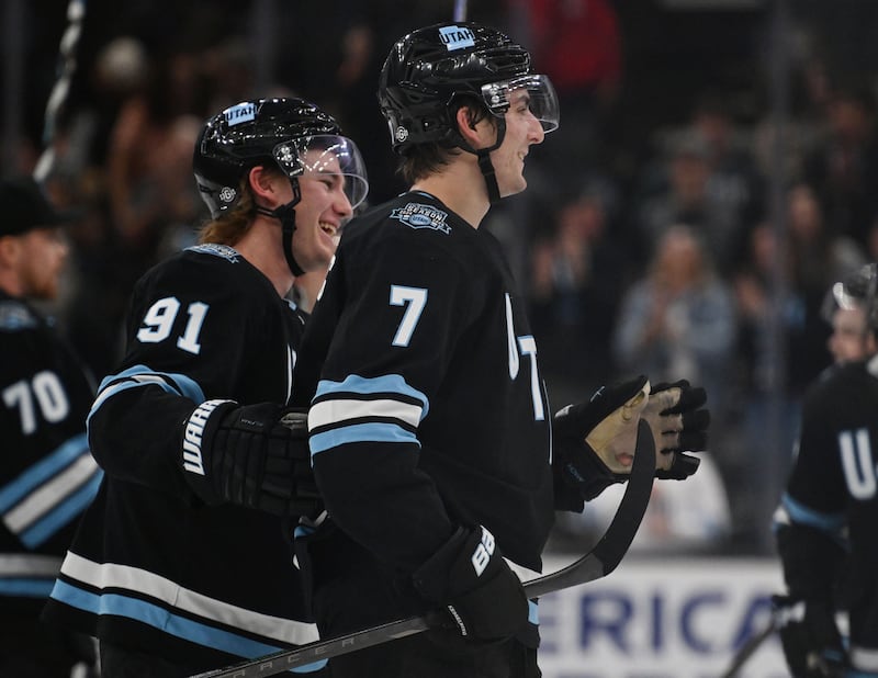Utah Hockey Club right wing Josh Doan (91) congratulates teammate Utah Hockey Club defenseman Michael Kesselring (7) after Kesselring’s overtime goal, giving Utah with win over the Boston Bruins at the Delta Center in Salt Lake City on Saturday Oct. 19, 2024. | Scott G Winterton, Deseret News