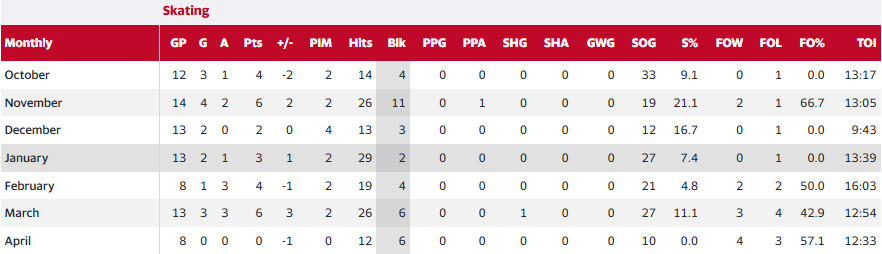 Anthony Beauvillier’s monthly splits.