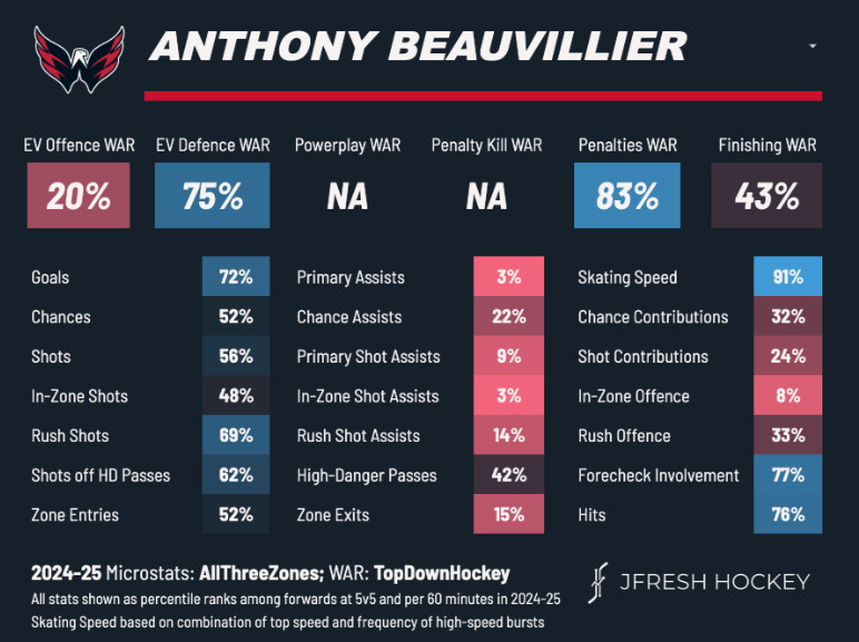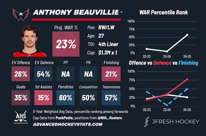 Not one metric stands out from the rest, but Beavillier did see a rebound of sorts with his defensive play. I’d be curious to see the year-to-year change in the projected WAR percentage after seemingly cratering during the 2023-24 campaign.