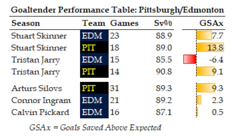 But Jarry is an entirely different story. His save percentage has slipped more than five percentage points since being dealt from Pittsburgh, and he’s more than six goals worse than a replacement-level goaltender would have performed in the same situation in Edmonton, based on the shot profile faced.