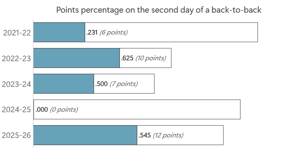 The Kraken continue to be nasty on the second night of back‑to‑backs. They have two more back‑to‑back sets remaining this season.