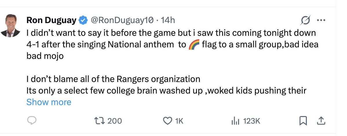 “I didn’t want to say it before the game but I saw this coming. Down 4–1 right after the singing National anthem to (the Pride Flag) to a small group, bad idea bad mojo,” Duguay wrote. “I don’t blame all of the Rangers organization. Its only a select few college brain washed up, woked kids pushing their agenda within the organization.