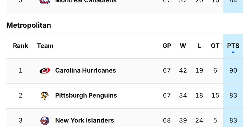Who: Pittsburgh Penguins (34-18-15, 83 points, 2nd place Metropolitan Division) @ Carolina Hurricanes (42-19-6, 90 points, 1st place Metropolitan Division)
