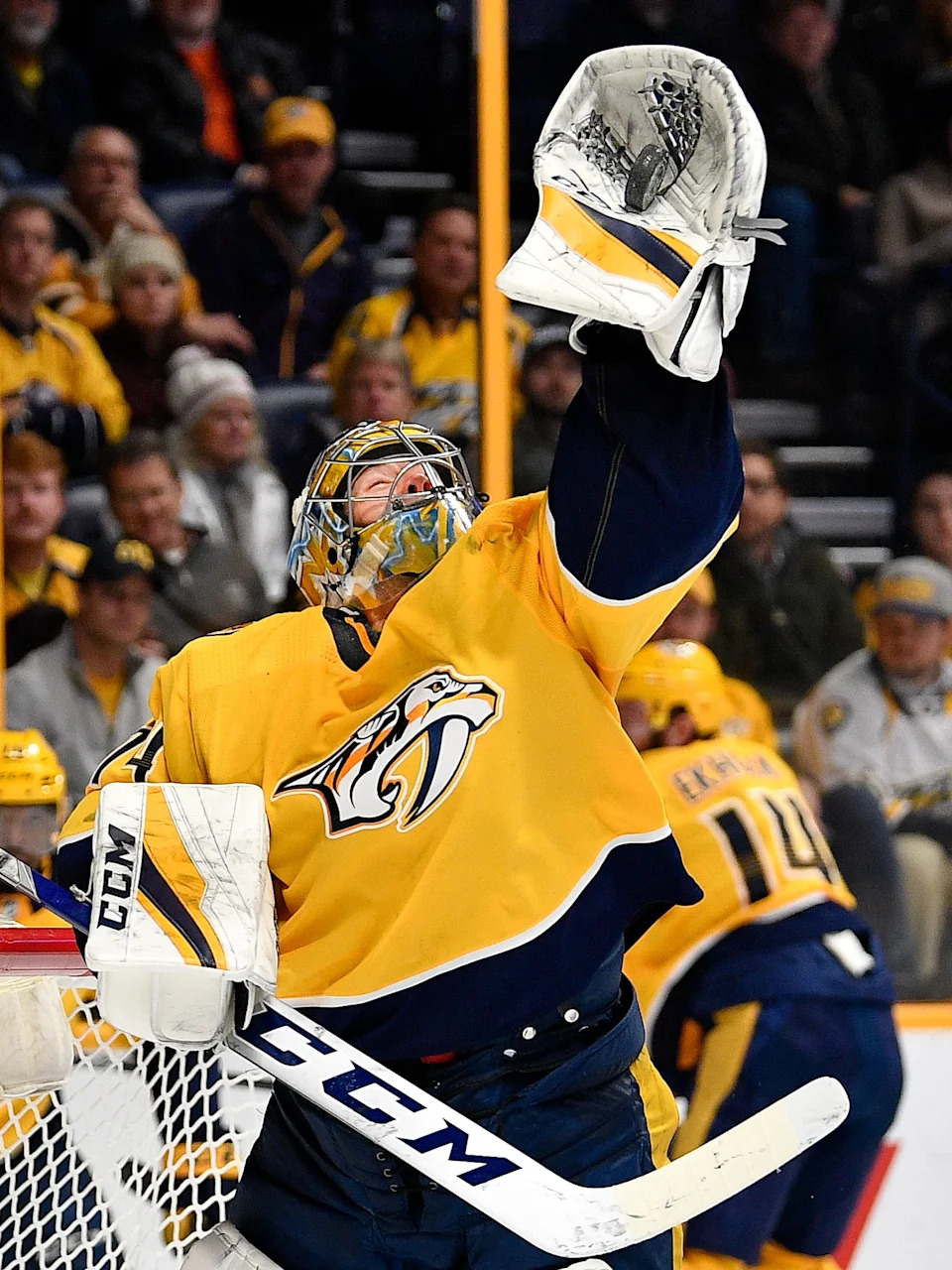 Nashville Predators goaltender Juuse Saros (74) catches a Vegas Golden Knights shot during the second period at Bridgestone Arena in Nashville, Tenn., Tuesday, Jan. 16, 2018.
