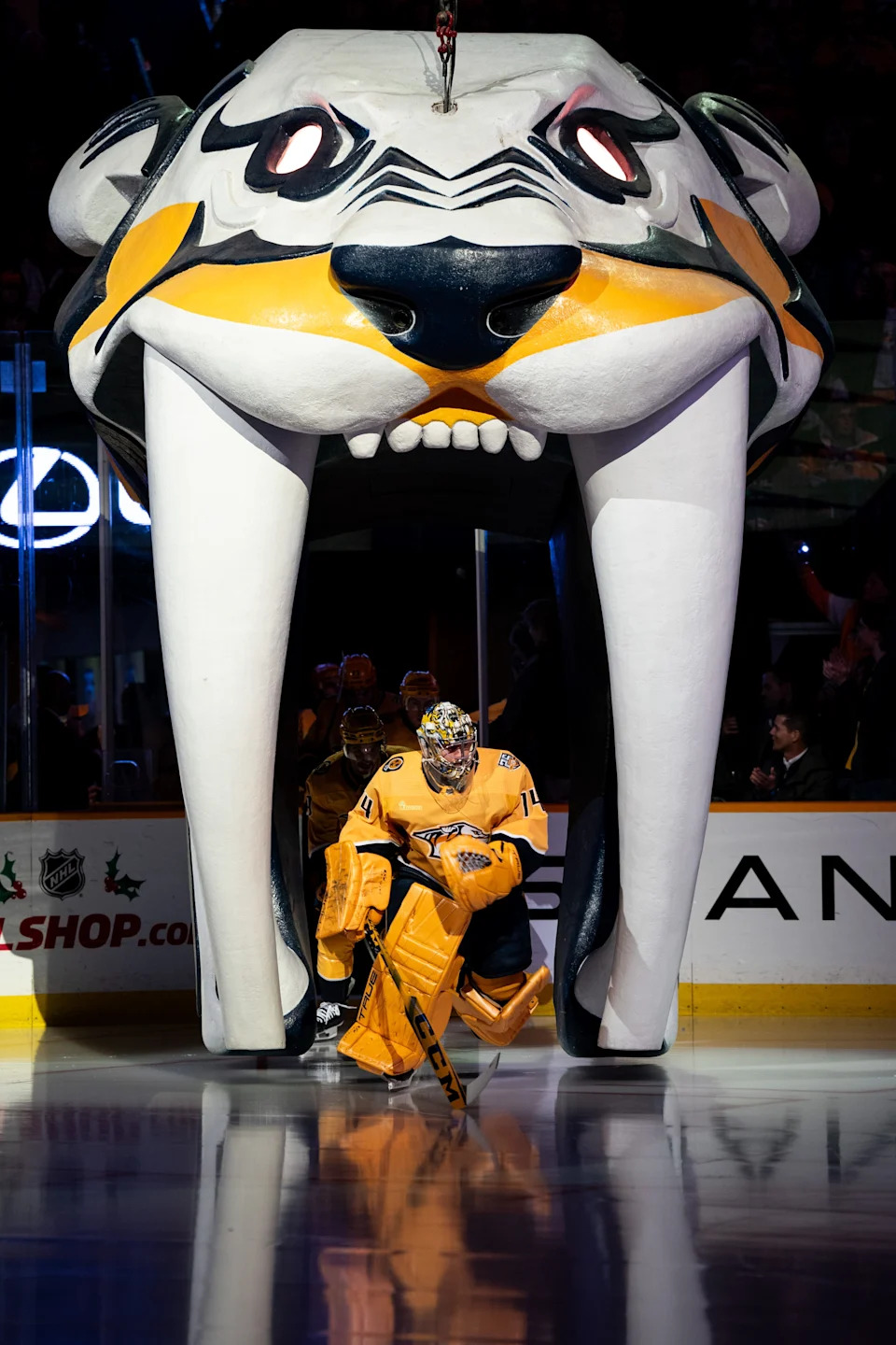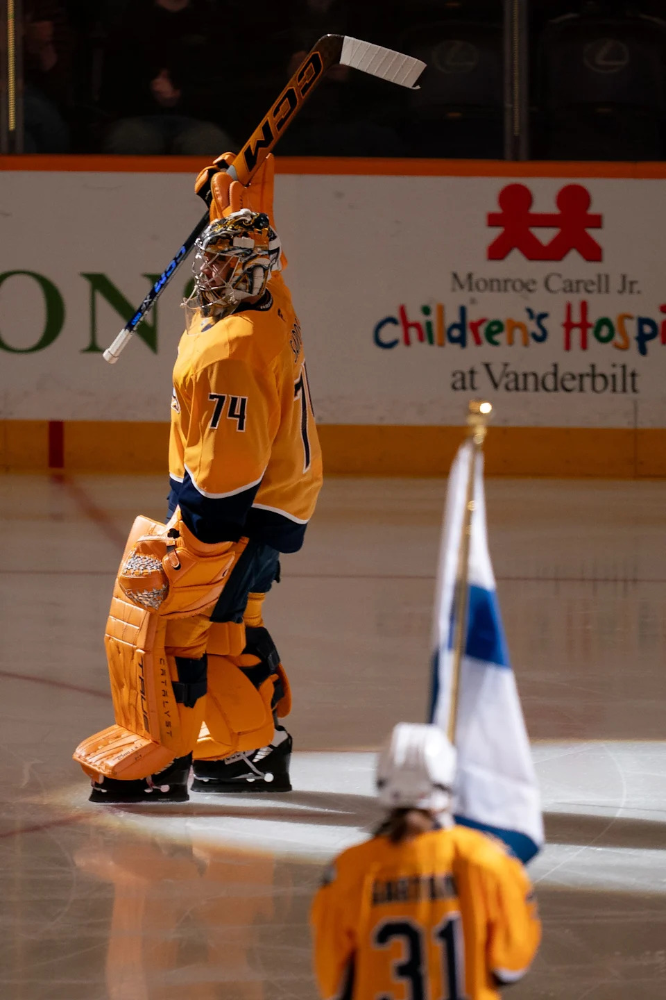Nashville Predators goaltender Juuse Saros (74) heads to the ice for warm ups before a game against the Calgary Flames at Bridgestone Arena in Nashville, Tenn., Wednesday, Nov. 22, 2023.