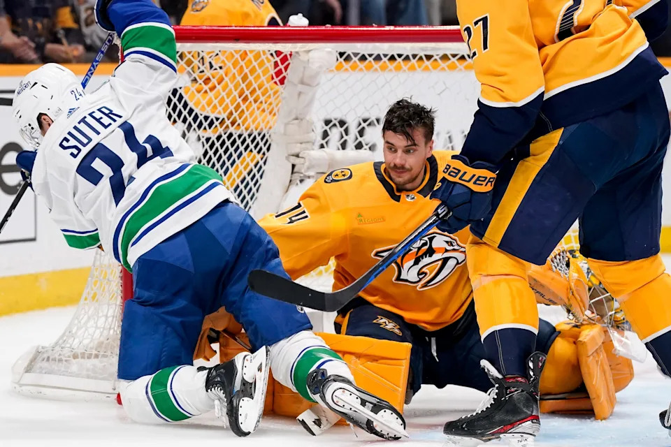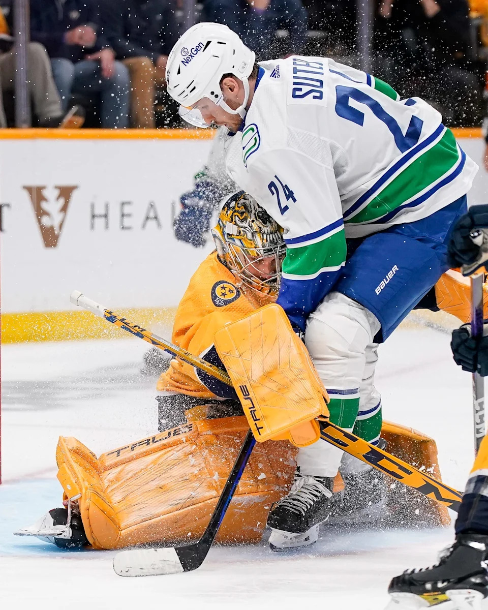 Vancouver Canucks center Pius Suter (24) crashes into Nashville Predators goaltender Juuse Saros (74) during the second period in Game 6 of an NHL hockey Stanley Cup first-round playoff series game at Bridgestone Arena in Nashville, Tenn., Friday, May 3, 2024.