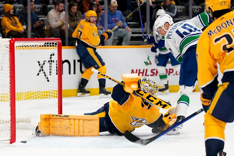 Nashville Predators goaltender Juuse Saros (74) deflects a shot from Vancouver Canucks center Elias Pettersson (40) during the second period at Bridgestone Arena in Nashville, Tenn., Tuesday, Dec. 19, 2023.