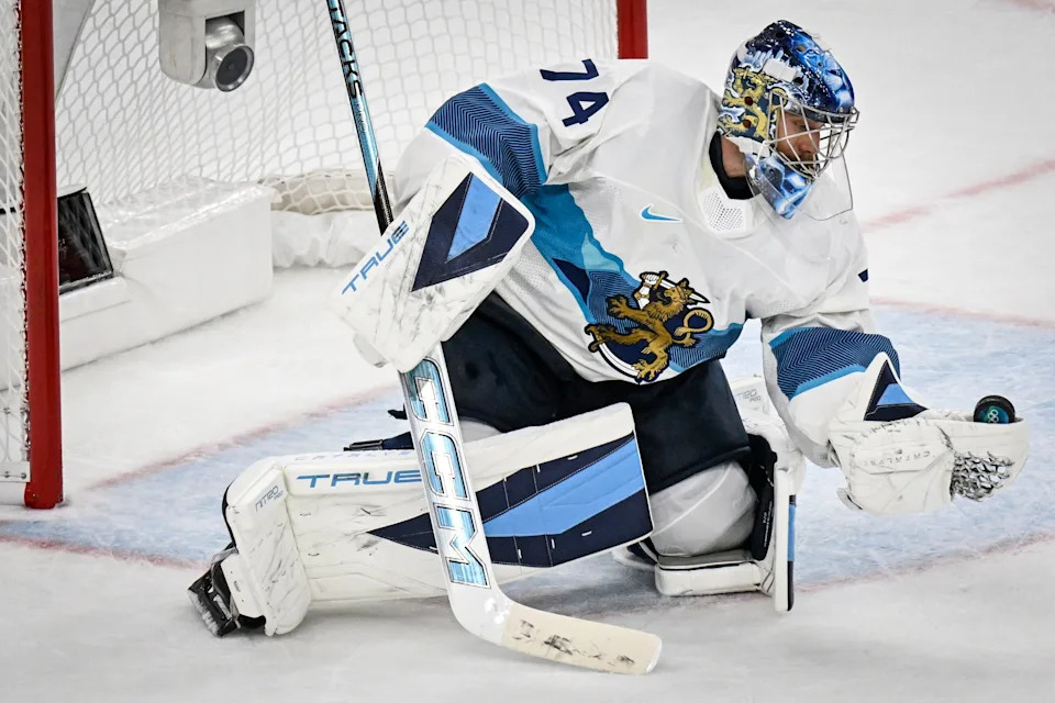 Finland’s #74 Juuse Saros catches the puck during the men’s preliminary round Group B Ice Hockey match between Slovakia and Finland at the Milano Santagiulia Ice Hockey Arena during the Milano Cortina 2026 Winter Olympic Games in Milan, on February 11, 2026. (Photo by Alexander NEMENOV / AFP via Getty Images)