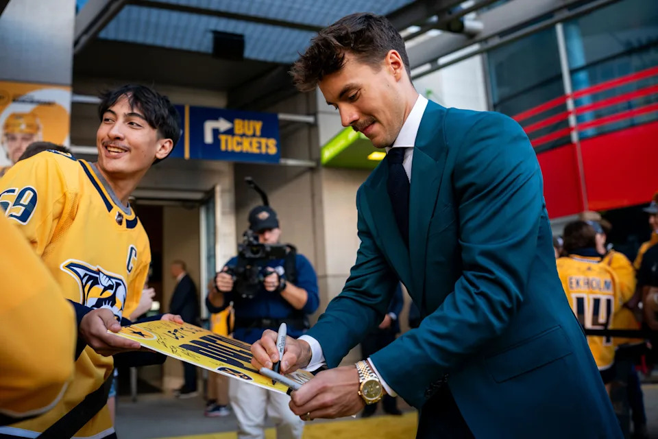 Nashville Predators goaltender Juuse Saros signs autographs during the Gold Walk before their home opener against the Columbus Blue Jackets at Bridgestone Arena in Nashville, Tenn., Thursday, Oct. 9, 2025.