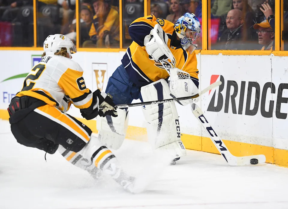 Nashville Predators goalie Juuse Saros (74) plays the puck in front of Pittsburgh Penguins forward Carl Hagelin (62) during a game on Oct. 22, 2016 in Nashville, Tenn.