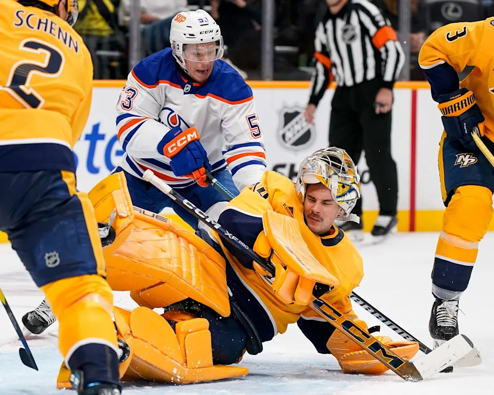 Edmonton Oilers center Jeff Skinner (53) scores a goal as Nashville Predators goaltender Juuse Saros (74) loses his mask during the second period at Bridgestone Arena in Nashville, Tenn., Thursday, Oct. 17, 2024.