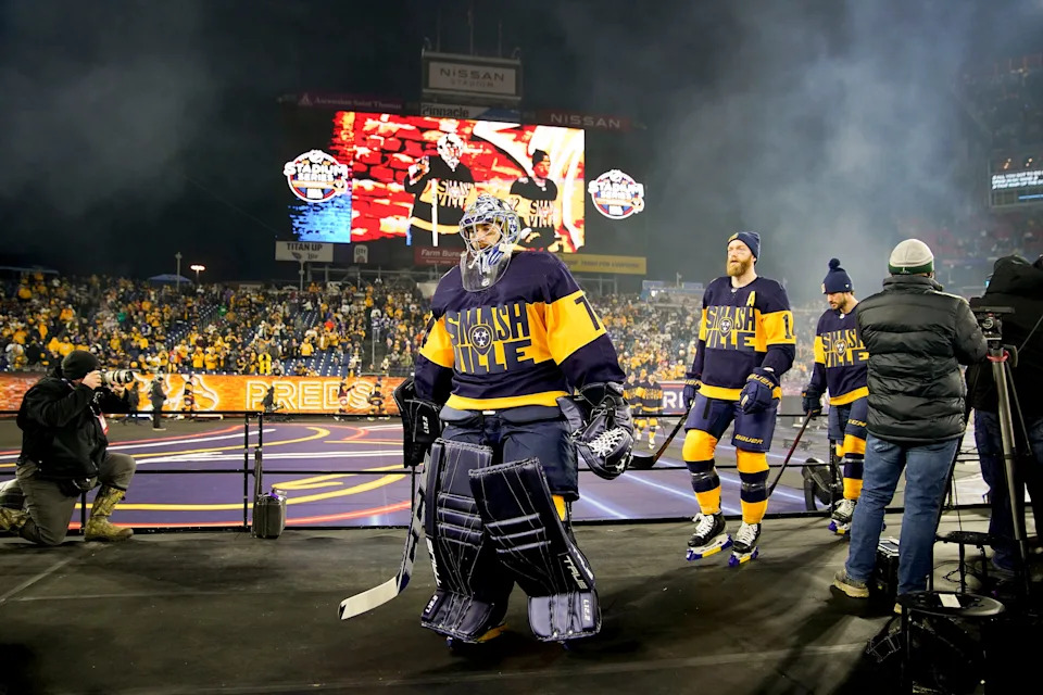 Nashville Predators goaltender Juuse Saros (74) gets arrives for the NHL Stadium Series game at Nissan Stadium in Nashville, Tenn., Saturday, Feb. 26, 2022.