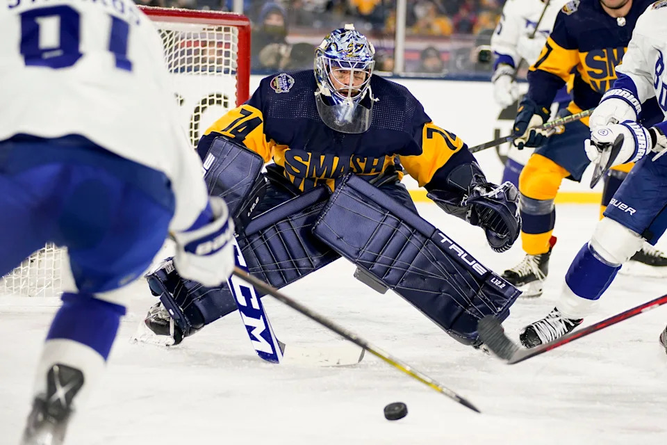Nashville Predators goaltender Juuse Saros (74) keeps his eyes on the puck during the second period of an NHL Stadium Series game at Nissan Stadium in Nashville, Tenn., Saturday, Feb. 26, 2022.